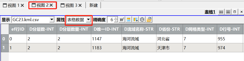 按钮,打开上一步中下载的GC23.kml.csv文件,选择使用文本读取器打开文件。在该图层属性面板中点击应用完成设置,生成GC23.kml.csv图层。该图层为表格数据,需点击视图窗口上方的新建按钮,新建视图2表格窗口查看文件内容。