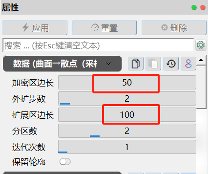 选中曲面->曲面(均一平滑)1图层,点击通用工具箱->曲面->曲面->散点(采样加密),将曲面->曲面(均一平滑)1图层设为输入曲面,将多边形1图层设为加密区域,点击确定生成曲面->散点(采样加密)1图层。在该图层属性面板数据子面板中,将加密区边长设为50,扩展区边长设为100,点击应用基于曲面->曲面(均一平滑)1图层三角形顶点和河流折线位置,生成在河流区域加密的散点。