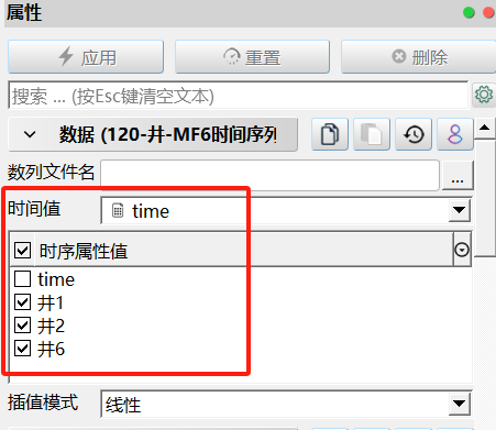 在该图层属性面板数据子面板中,时间值选择time列,在时序属性值中选择井1、井2和井6数列,点击应用完成设置,生成抽水井边界的抽水率时间序列文件。在弹出的调试窗口,会显示井1、井2和井6时间序列对应的数值标记为-9991、-9990和-9989,将使用该数值赋值模型抽水井边界参数。