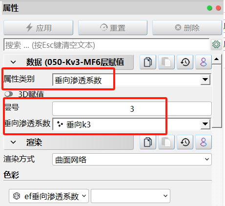 选项,在数据子面板中将属性类别选为水平渗透系数,层号为2,水平渗透系数选择水平k2数列。在渲染子面板中将渲染方式改为曲面网络,色彩设置为ef水平渗透系数,点击应用完成第二层网格水平渗透系数设置。