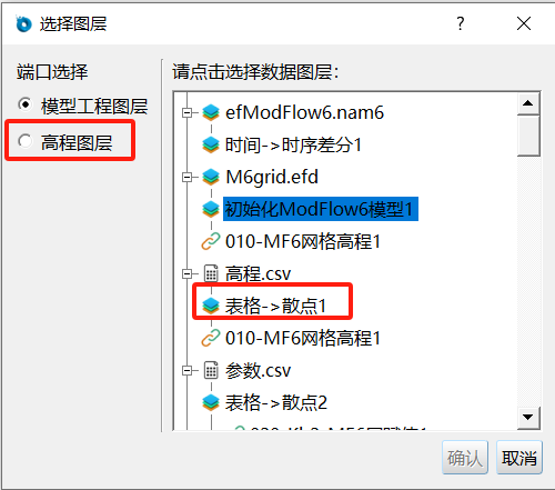 选择初始化MODFLOW6模型1图层,点击数值模拟-> MODFLOW6水流->MF6网格高程,选择初始化MODFLOW6模型1图层为模型工程层,选择表格->散点1图层为高程图层,点击确认生成MF6网格高程1图层,将其重命名为010- MF6网格高程1图层。