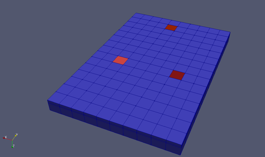 重复步骤3-5,分别导入表示补给区2和补给区3的形文件,并使用计算器工具为其添加-9995和-9994的入渗序列。通过MF6多边形赋值工具,分别生成090-补给2- MF6多边形赋值2和100-补给3- MF6多边形赋值3图层。赋值完毕后的模型网格如下图所示: