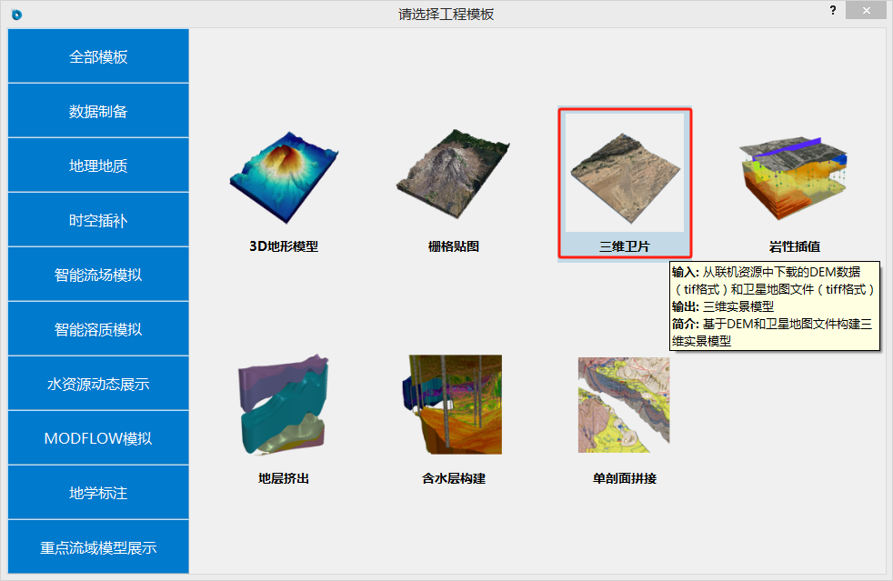 在界面中选择数据制备->三维卫片工程模板,双击磁贴打开工程模板。