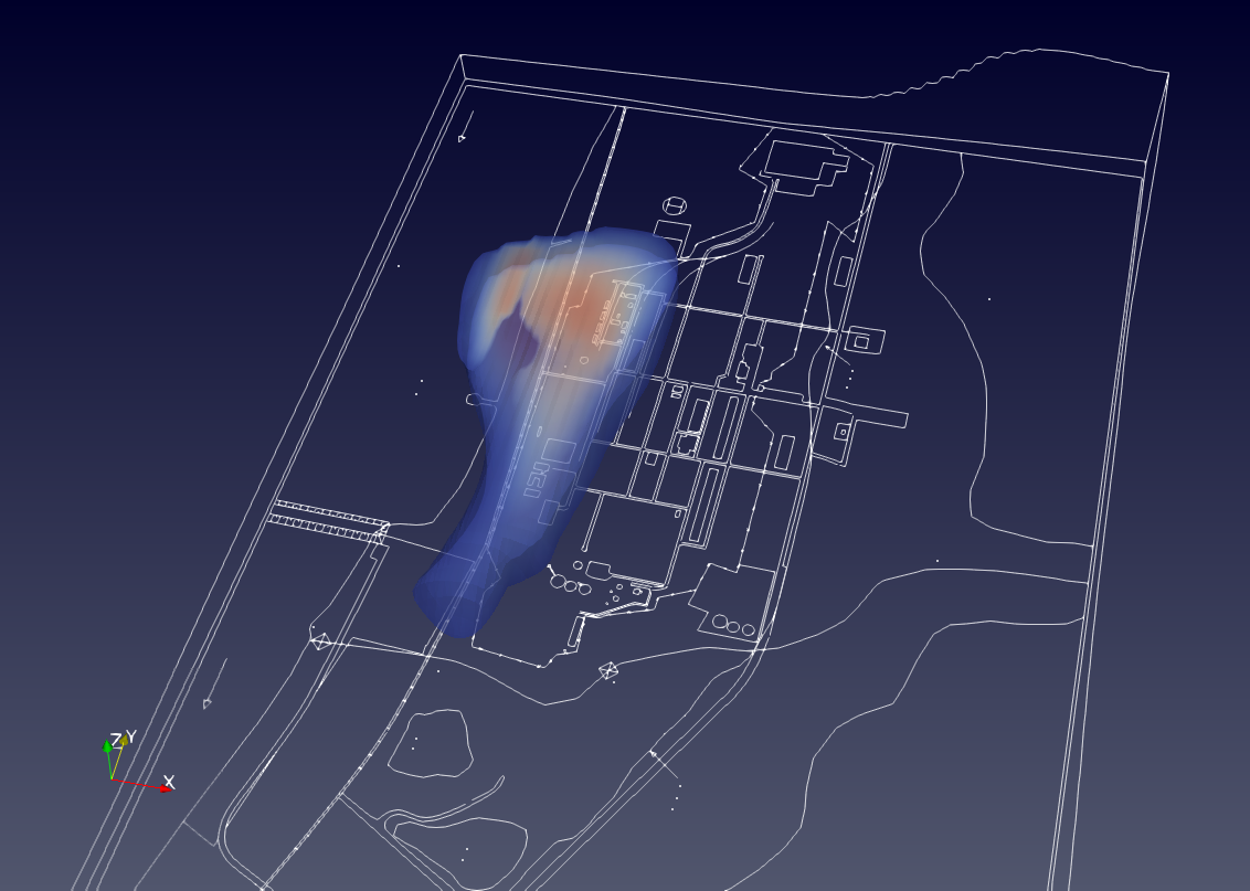 按钮,将动画调整到最后一个时间步,污染烟羽如下图所示: