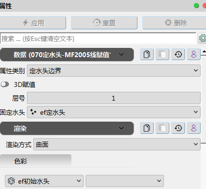 选中060图层,进行MF2005线赋值快速操作,模型工程图层选择060图层,属性图层定水头值-计算器2,生成MF2005线赋值1图层,将其命名为070定水头MF2005线赋值1图层。在该图层属性面板中,属性类别选择定水头边界,层号为1,固定水头选择散点ef定水头,单击应用。将初始水头以曲线显示,即可在视图1中看到定义好的定水头。