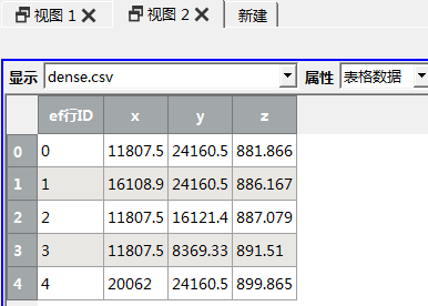 按钮,打开算例文件夹中的dense.csv文件,生成dense.csv图层,在该图层属性面板中点击应用完成设置。导入用于细化网格的点位置文件,在视图2中以表格形式可以进行查看。