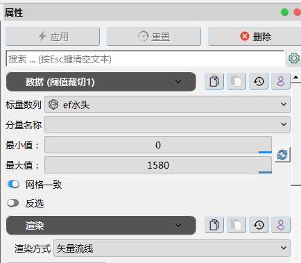 由于非活动区域水位值为0,需要对该区域进行裁切。选中efModFlow2005.nam图层,进行阈值裁切快速操作,生成阈值裁切1图层。在该图层属性面板,标量数列选择ef水头,最小值设为0,最大值设为1580,点击应用,完成设置。