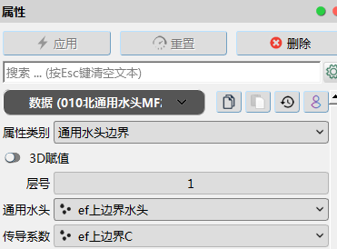 在010北通用水头-线赋值图层属性面板中选择属性类别为通用水头边界,层号为1,通用水头和传导系数分别选择为上边界水头和上边界C数列,点击应用完成设置。