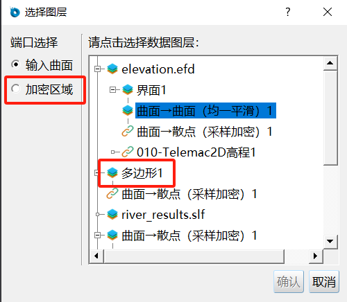 点击数值模拟-> Telemac地表水2D ->Telemac2D选区赋值,生成Telemac2D选区赋值1图层,将其重命名为020-上游定流量-Telemac2D选区赋值1图层