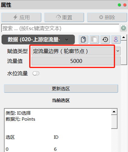 本项目将在河流的上游和下游的轮廓节点上分别设置定流量和定水头边界,为了模型的展示效果,上游的流量设置较大,为5000m3/s。